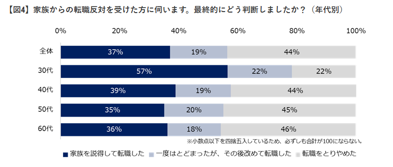 さらに恐ろしいことに、家族の反対にあった人のうち約半数が「内定を辞退」または「転職自体を諦める」という決断を下しているというデータもあるほどです。